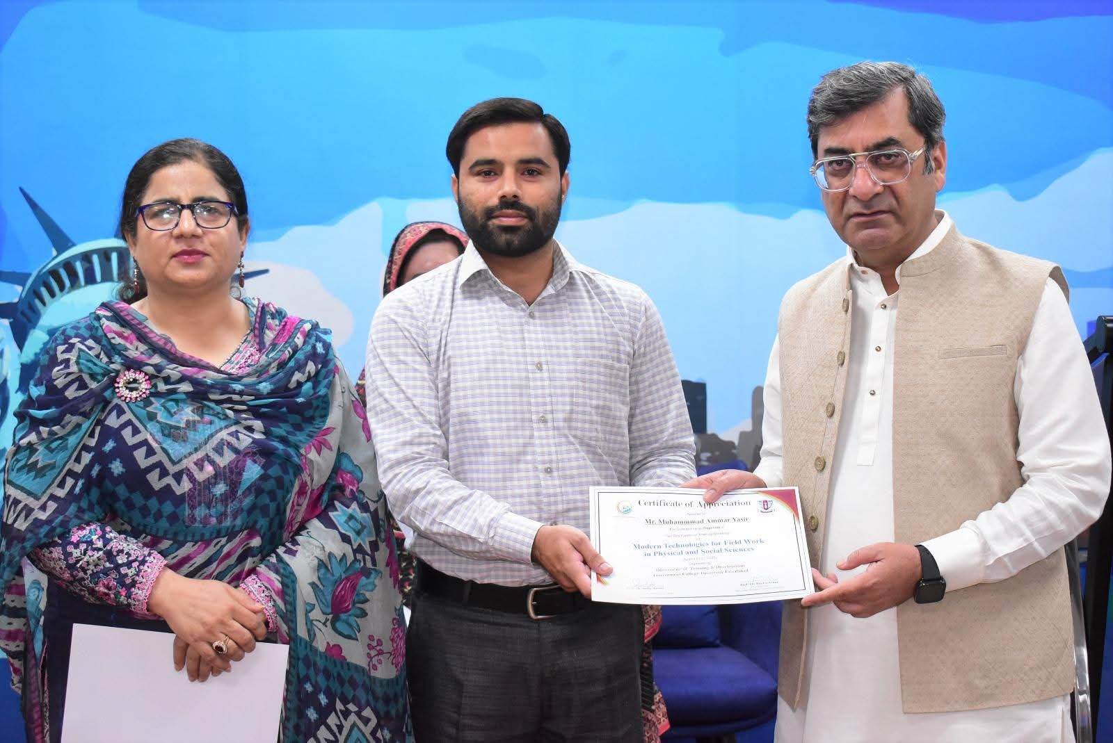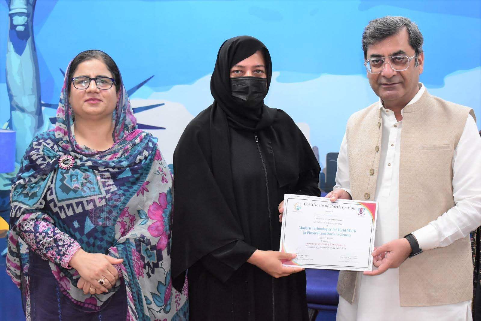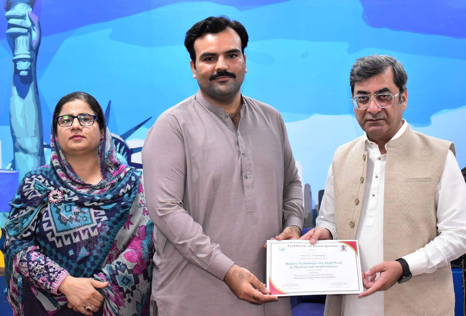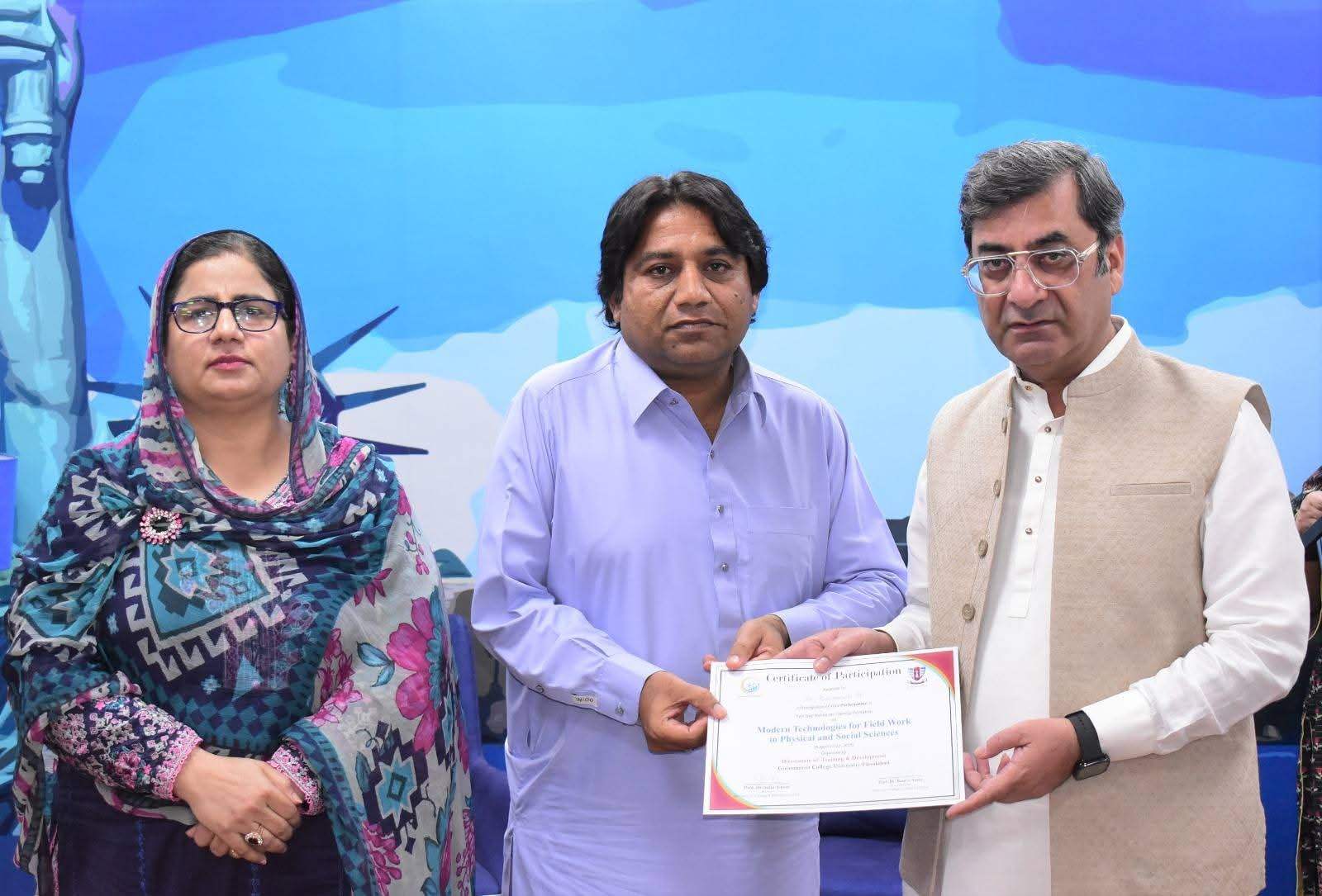 Government College University Faisalabad successfully organized a Two-Day Hands-on Training Workshop on Modern Technologies for Field Work in Physical and Social Sciences departments. The workshop was conducted under the patronage of Prof. Dr. Rauf-i-Azam, Vice-Chancellor of GCUF, and organized by the Directorate of Training and Development, with Dr. Shoaib Khalid, Assistant Professor, Department of Geography, serving as the resource person.