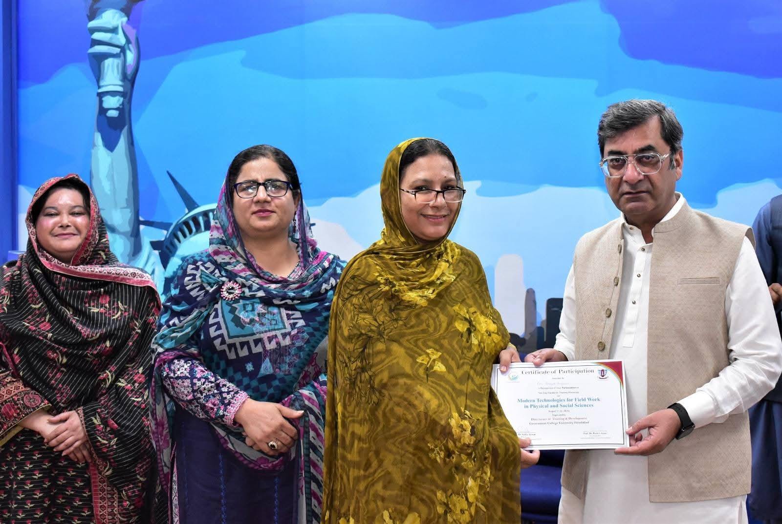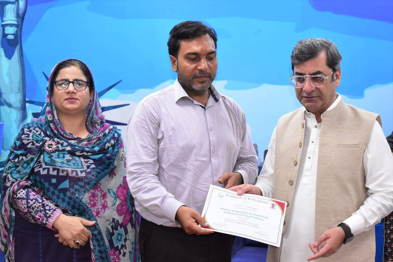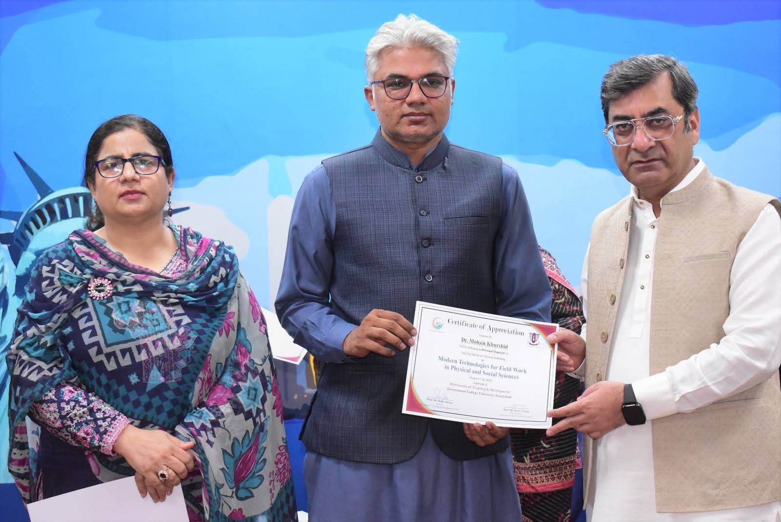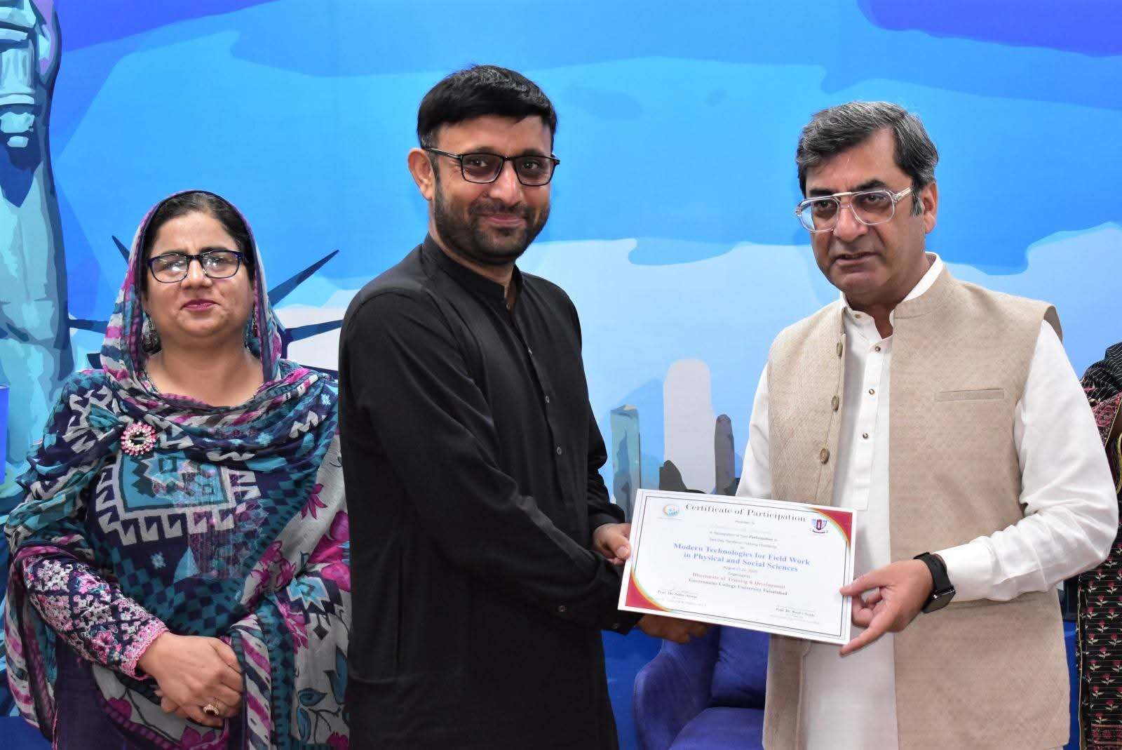 Government College University Faisalabad successfully organized a Two-Day Hands-on Training Workshop on Modern Technologies for Field Work in Physical and Social Sciences departments. The workshop was conducted under the patronage of Prof. Dr. Rauf-i-Azam, Vice-Chancellor of GCUF, and organized by the Directorate of Training and Development, with Dr. Shoaib Khalid, Assistant Professor, Department of Geography, serving as the resource person.