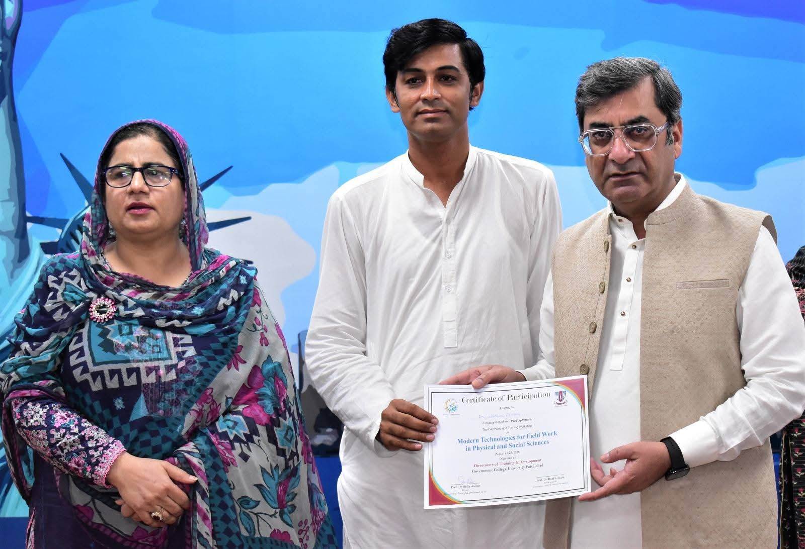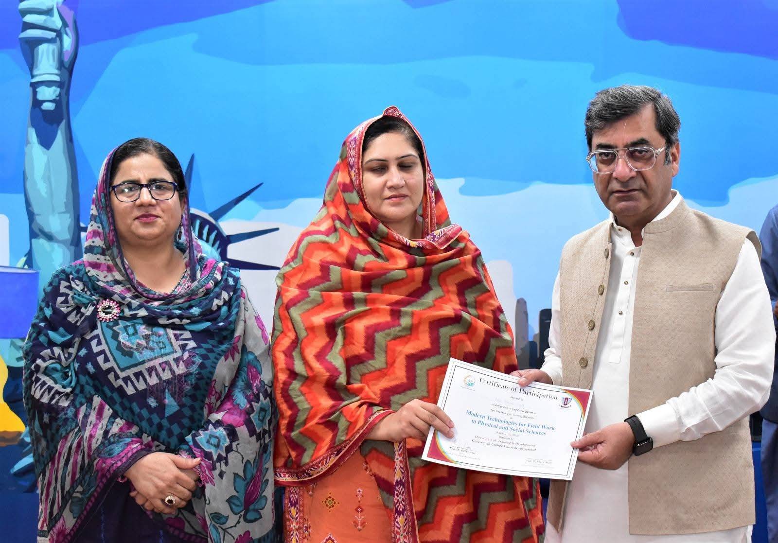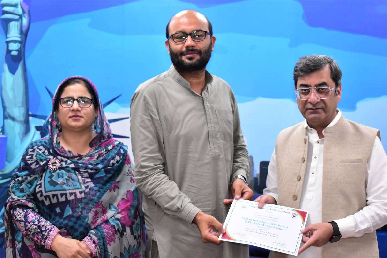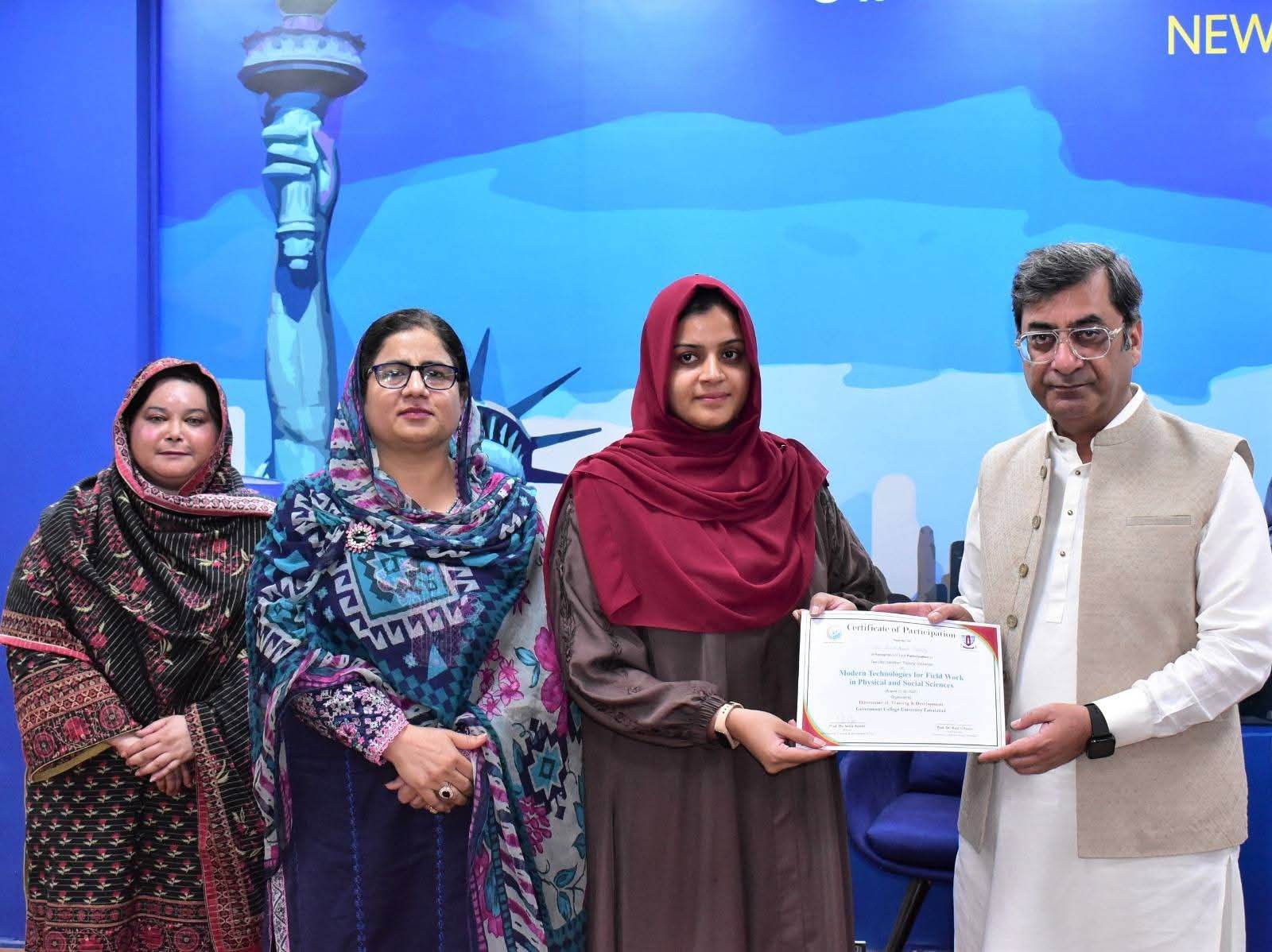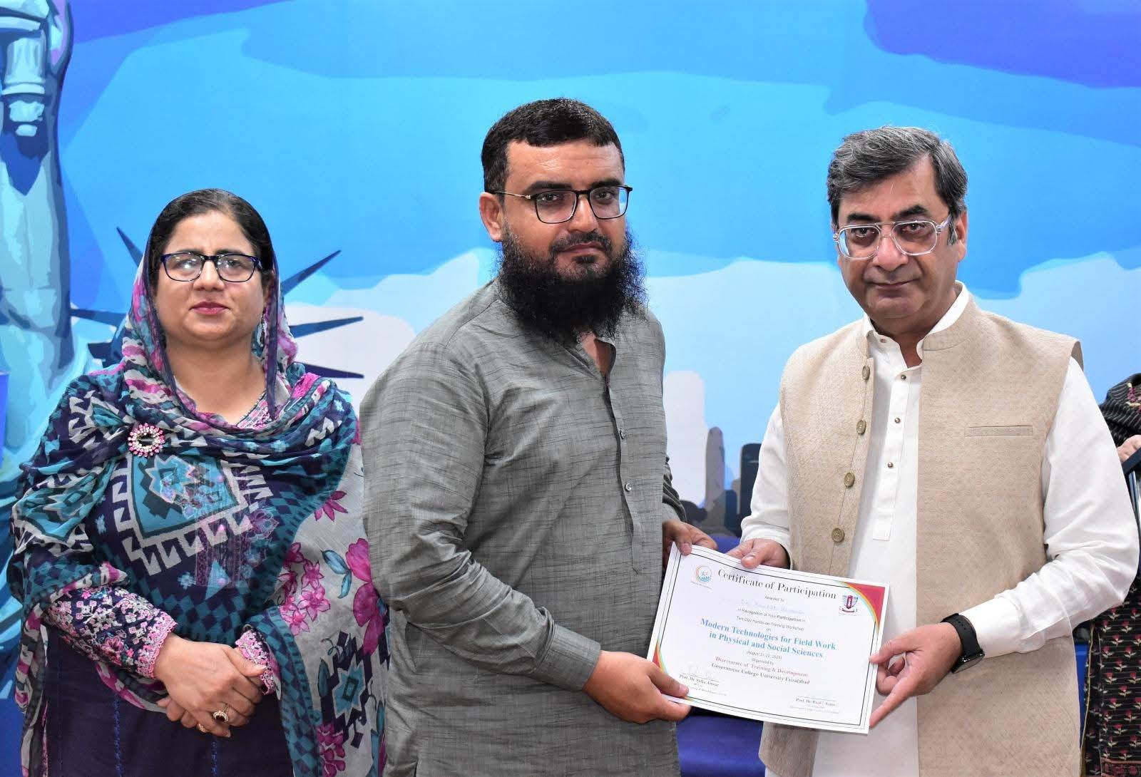Government College University Faisalabad successfully organized a Two-Day Hands-on Training Workshop on Modern Technologies for Field Work in Physical and Social Sciences departments. The workshop was conducted under the patronage of Prof. Dr. Rauf-i-Azam, Vice-Chancellor of GCUF, and organized by the Directorate of Training and Development, with Dr. Shoaib Khalid, Assistant Professor, Department of Geography, serving as the resource person.