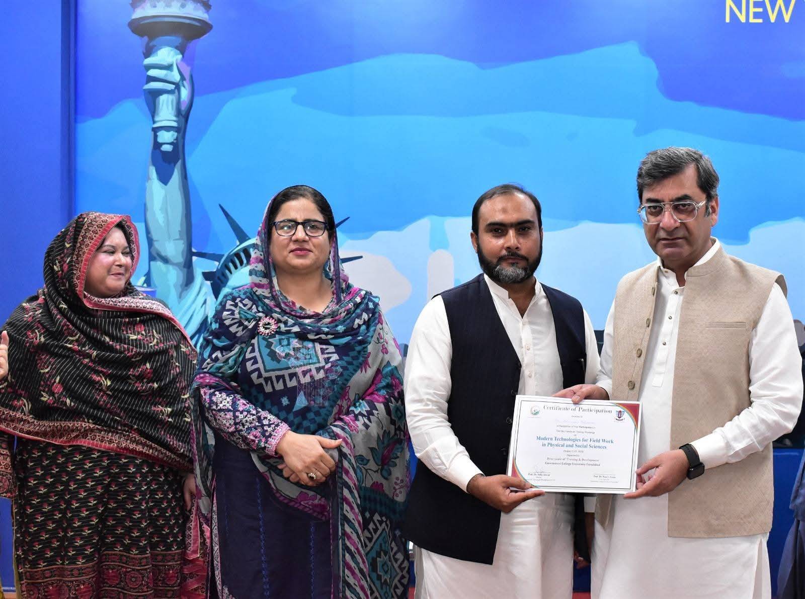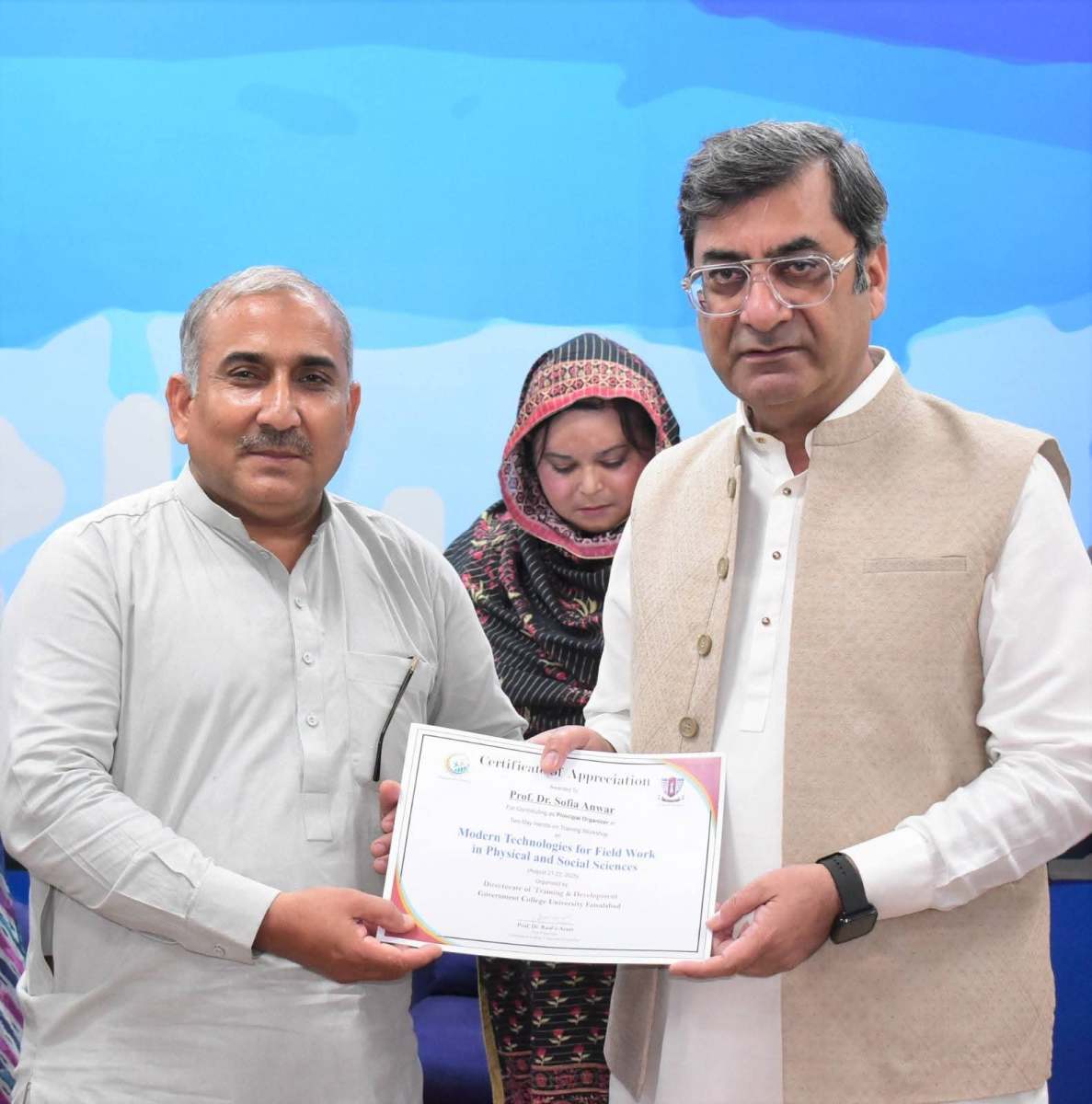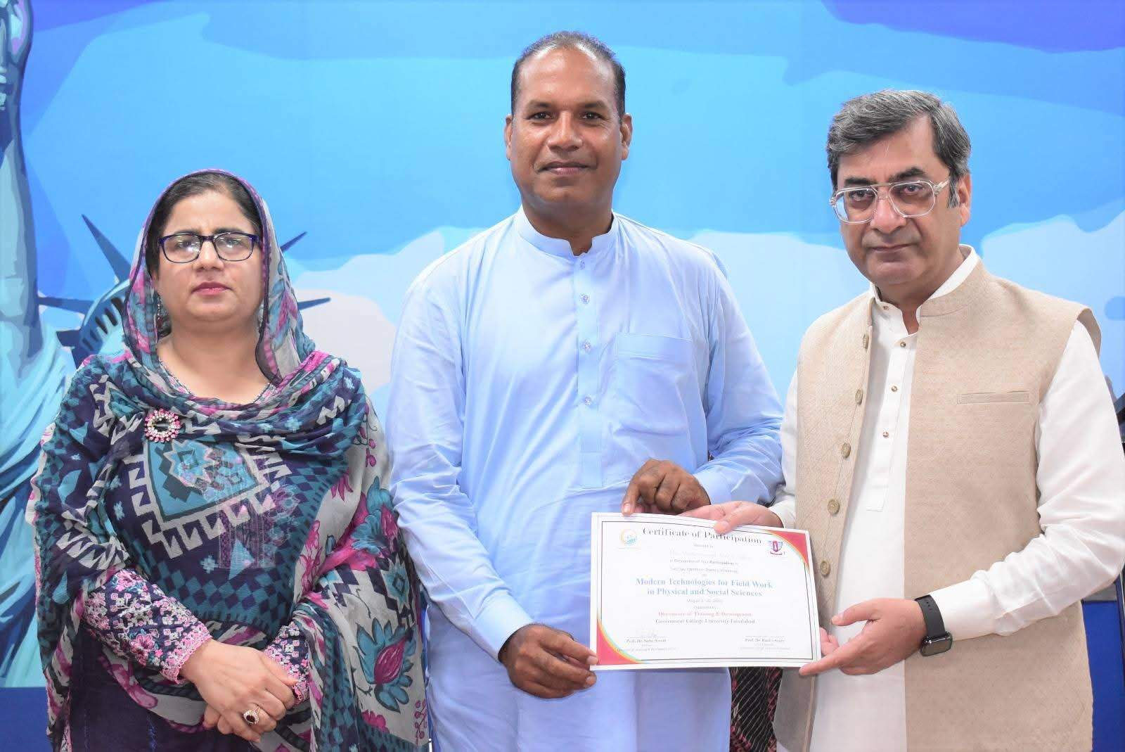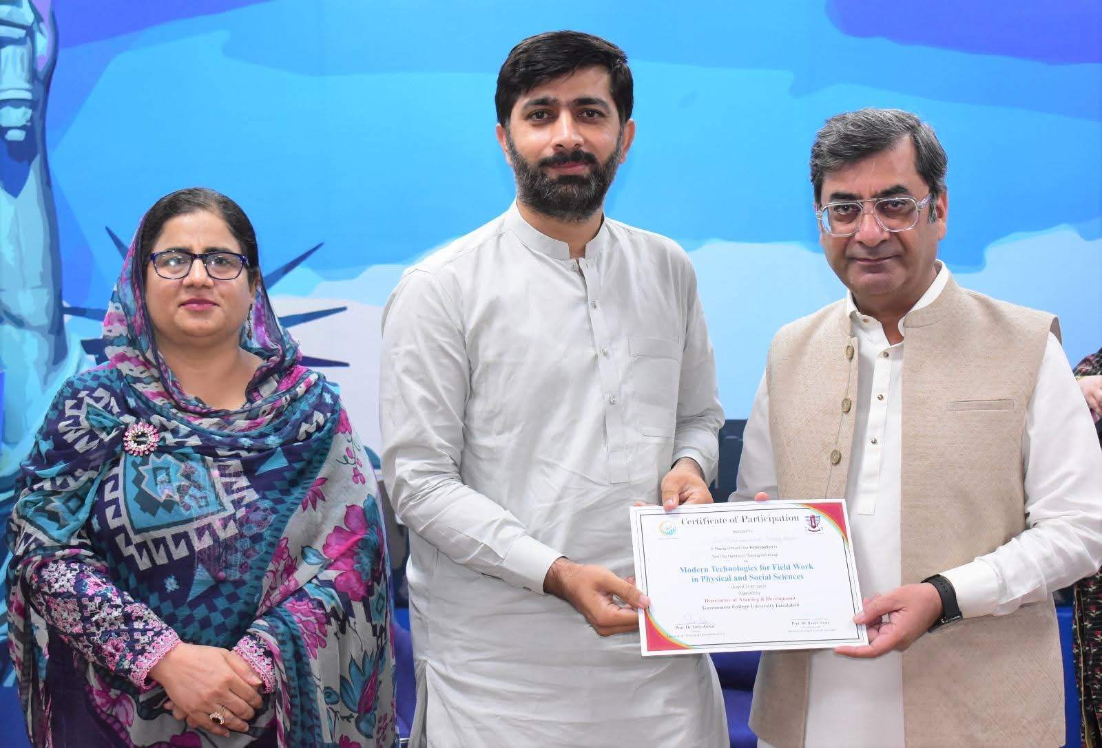 Government College University Faisalabad successfully organized a Two-Day Hands-on Training Workshop on Modern Technologies for Field Work in Physical and Social Sciences departments. The workshop was conducted under the patronage of Prof. Dr. Rauf-i-Azam, Vice-Chancellor of GCUF, and organized by the Directorate of Training and Development, with Dr. Shoaib Khalid, Assistant Professor, Department of Geography, serving as the resource person.