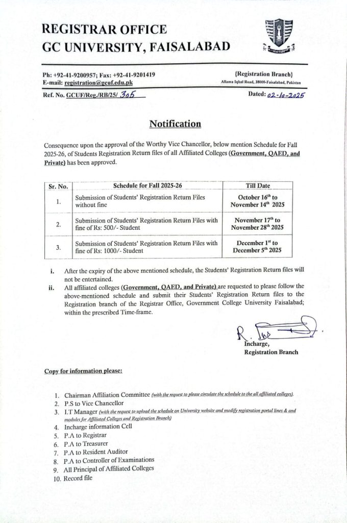 Schedule for Fall 2025-2026, of Students Registration Return files of all Affiliated Colleges