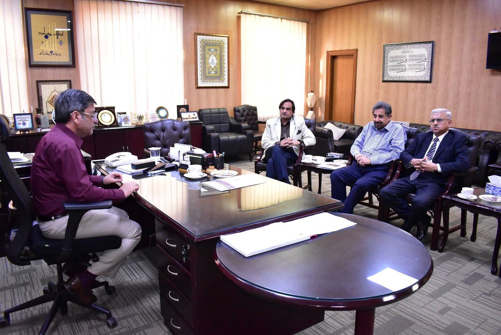 During the meeting, Vice Chancellor Prof. Dr. Rauf-i-Azam appreciated the valuable services and continued support of Dr. Soulat Nawaz, Senior Advocate Fayyaz Butt, and Zeeshan Ahmad Khan in the construction of the school.