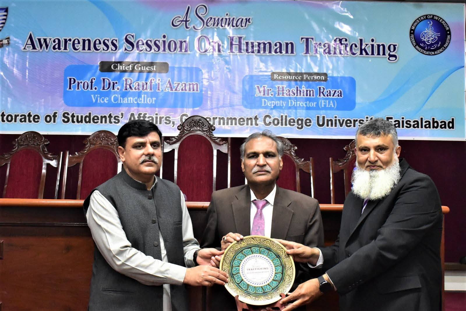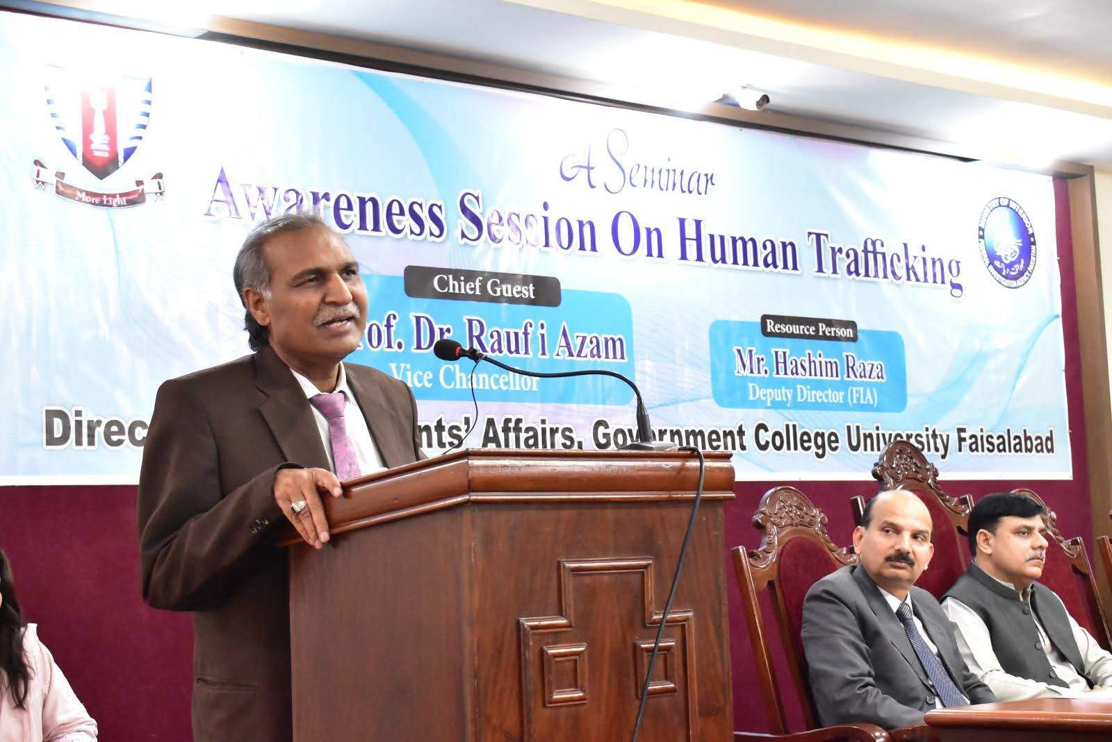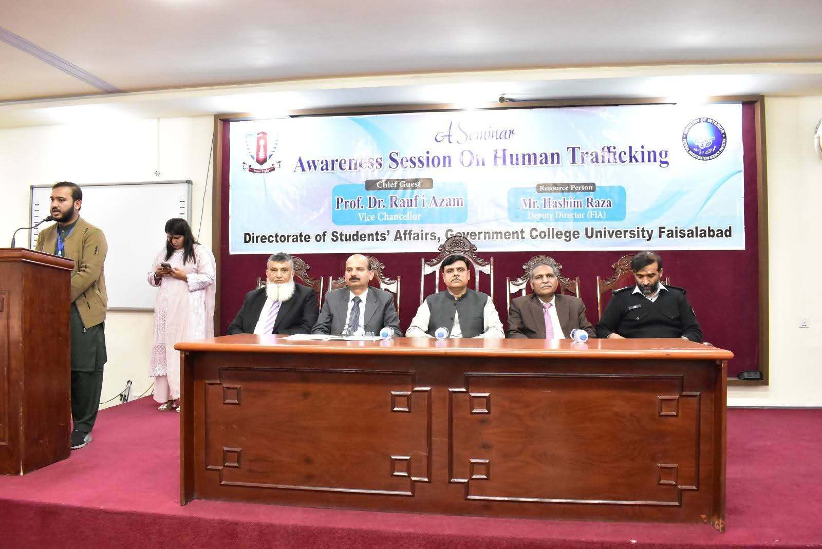 A seminar on human trafficking was organized at Government College University Faisalabad under the auspices of the Directorate of Student Affairs to raise awareness among students and faculty about the growing menace of human trafficking and its far-reaching consequences.