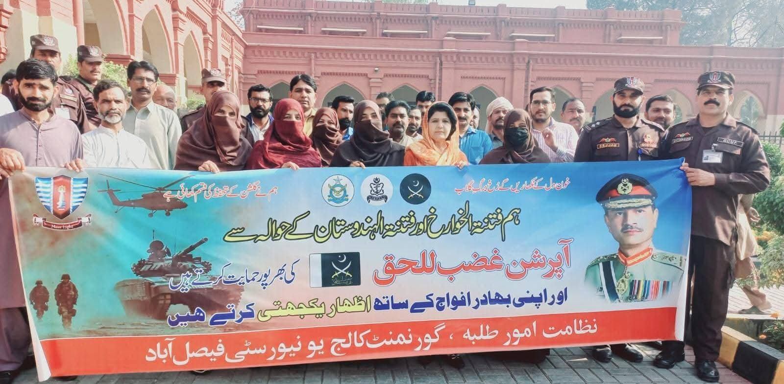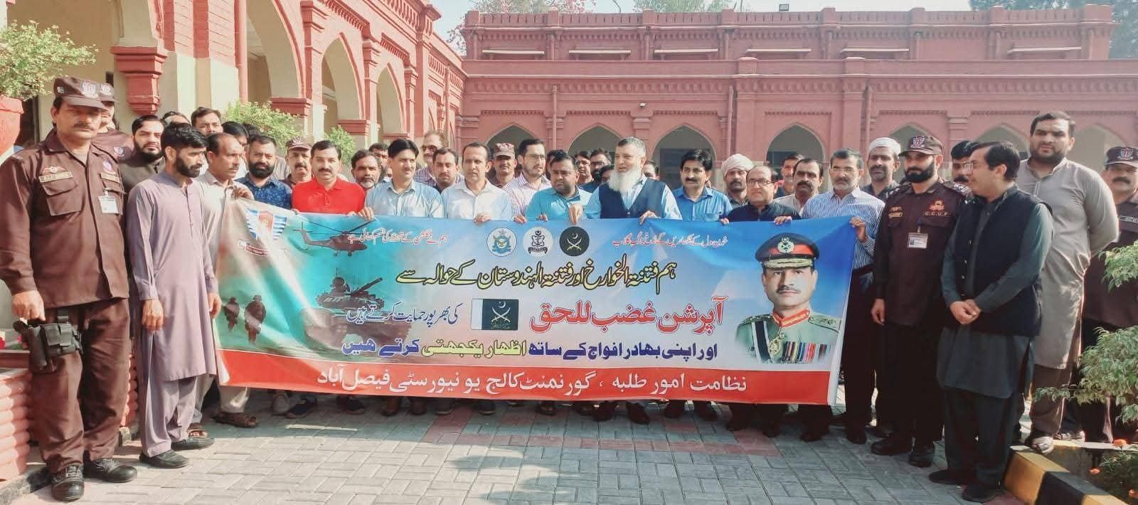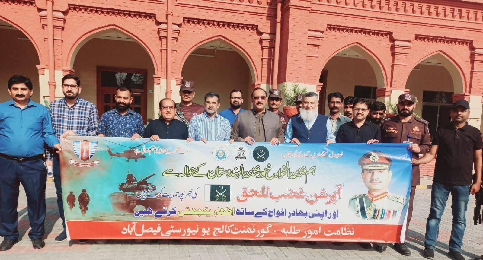 A rally was organized at Government College University Faisalabad in support of Operation Ghazab-ul-Haq and to express solidarity with the Pakistan Armed Forces. The rally was led by Director Students Affairs Dr. Nadeem Sohail.